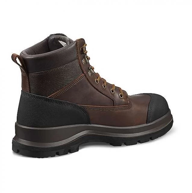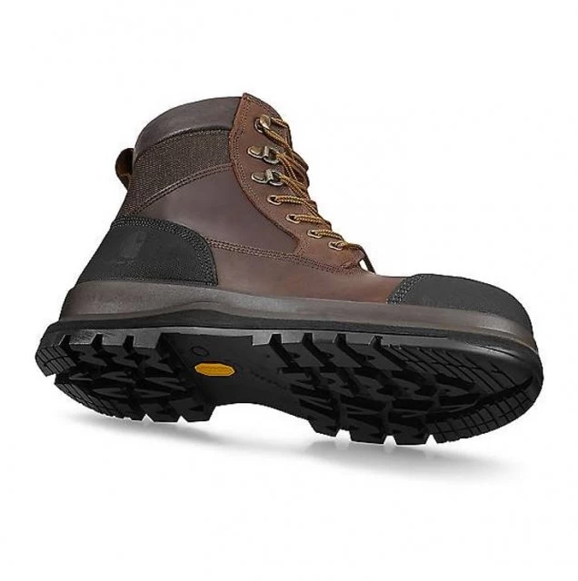 A versatile waterproof safety boot that can be worn on or off site with ease in dry and wet conditions. Built with a fiberglass safety toe this boot upholds the S3 standards and will protect your feet from 200 joules of weight and impact. Comfort is also addressed with a fully cushioned shock absorption footbed to reduce fatigue, a non-metal light weight anti-penetration plate prevents sharp objects piercing the sole and causing injury to the foot. The Vibram rubber outsole provides added traction in design with anti-slip, heat and oil resistance. Leather appearance can scratch when in contact with abrasive surfaces, treat leather with a cream polish. For tasks that require kneeling for long periods, we recommend a style with a scuff toe cap. Expect Carhartt safety footwear to fit a half size larger than your standard footwear size.
