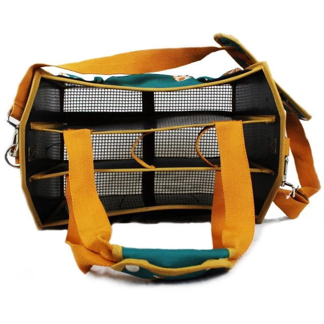 Open-topped rigid bag with multiple compartments and pockets, as well as a removable shoulder strap. Features a mesh base.