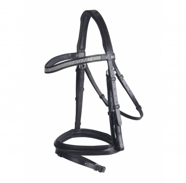 A beautifully crafted leather bridle, with an anatomically shaped padded headpiece to relieve poll pressure and contour around the ears, also with a padded cavesson noseband to provide extra comfort for your horse. Comes as standard with a diamante browband. The bridle comes with rubber grip reins., Black