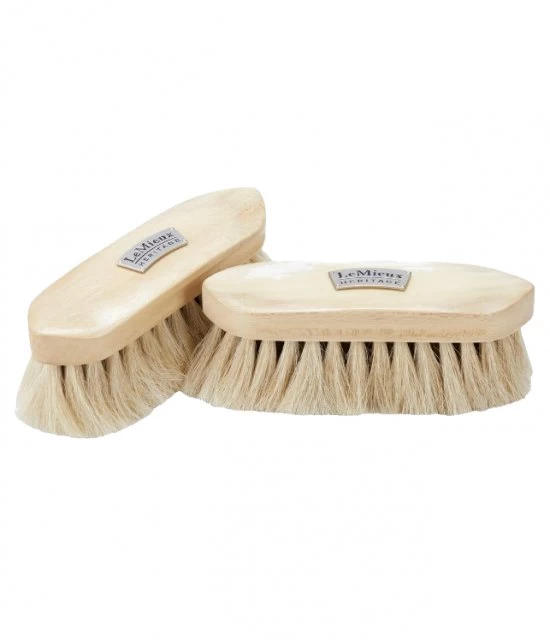 This natural soft finishing brush will bring out the ultimate shine in horses coats. Slightly more resistant alternative to the Goats Hair Brush. Made with anti-static natural bristle. Complete with a solid grained wooden handle grooved on the outside for ease of grip and beautiful solid metal LeMieux Heritage badge.