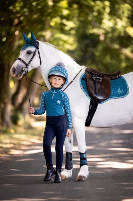 At last a premium designer collection for Kids! Mini LeMieux is intended to appeal to the under twelves with an eye for style. Designed particularly for 11.2hh to 13hh ponies, the Mini LeMieux Fly Hood is hand made from two styles of close-knit crochet with comfortable high-density fabric ears that soften sound. Suede embroidered detailing and colour matched braid complete the range.