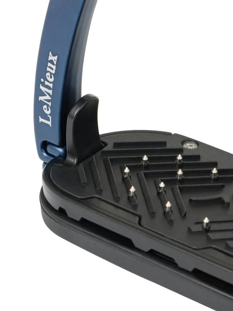 An integrated hinged arm has a two-stage release system, preventing unintentional opening. The spring loaded arm locks into the base of the main frame meaning that when under maximum pressure, such as landing over a fence, the rider’s weight is spread evenly across the stirrup, preventing the outside dropping and flexing. When pressure is put onto the arm of the stirrup, the arm releases allowing the foot to come out of the stirrup and preventing it getting stuck. The stirrup arm breakout force = 36N (equivalent to 3.62kg) in testing meaning enough resistance to stop it opening unintentionally but will release when needed.