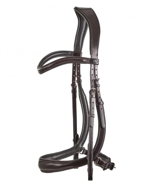 The anatomically shaped, padded poll piece has been carefully designed to distribute pressure over the less sensitive areas of the poll and away from the ears. A padded, shaped browband creates definition and the round raised design offers an elegant aesthetic. The anatomically shaped snaffle noseband dips down to avoid contact with the horse’s cheekbones, alleviating pressure and potentially heightening performance.