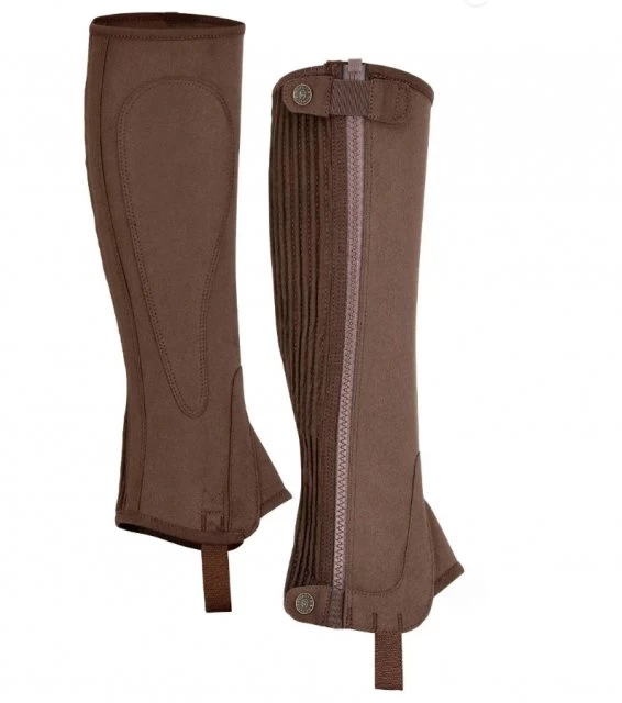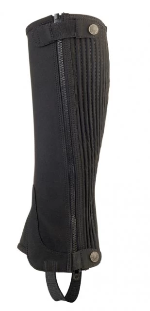 Constructed in amara fabric these half chaps offer excellent grip even when wet and great durability. Elastic full length inserts, full length zips, elastic foot stirrups, stretch zip tidy straps, bound edges.