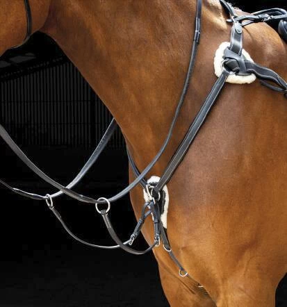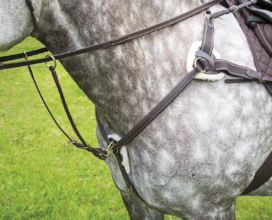Super breastplate from the Salisbury range featuring contrast stitching, padded leatherwork and sheepskin pressure pads which can be removed for cleaning. Detachable martingale attachment, elastic inserts, stainless steel fittings.